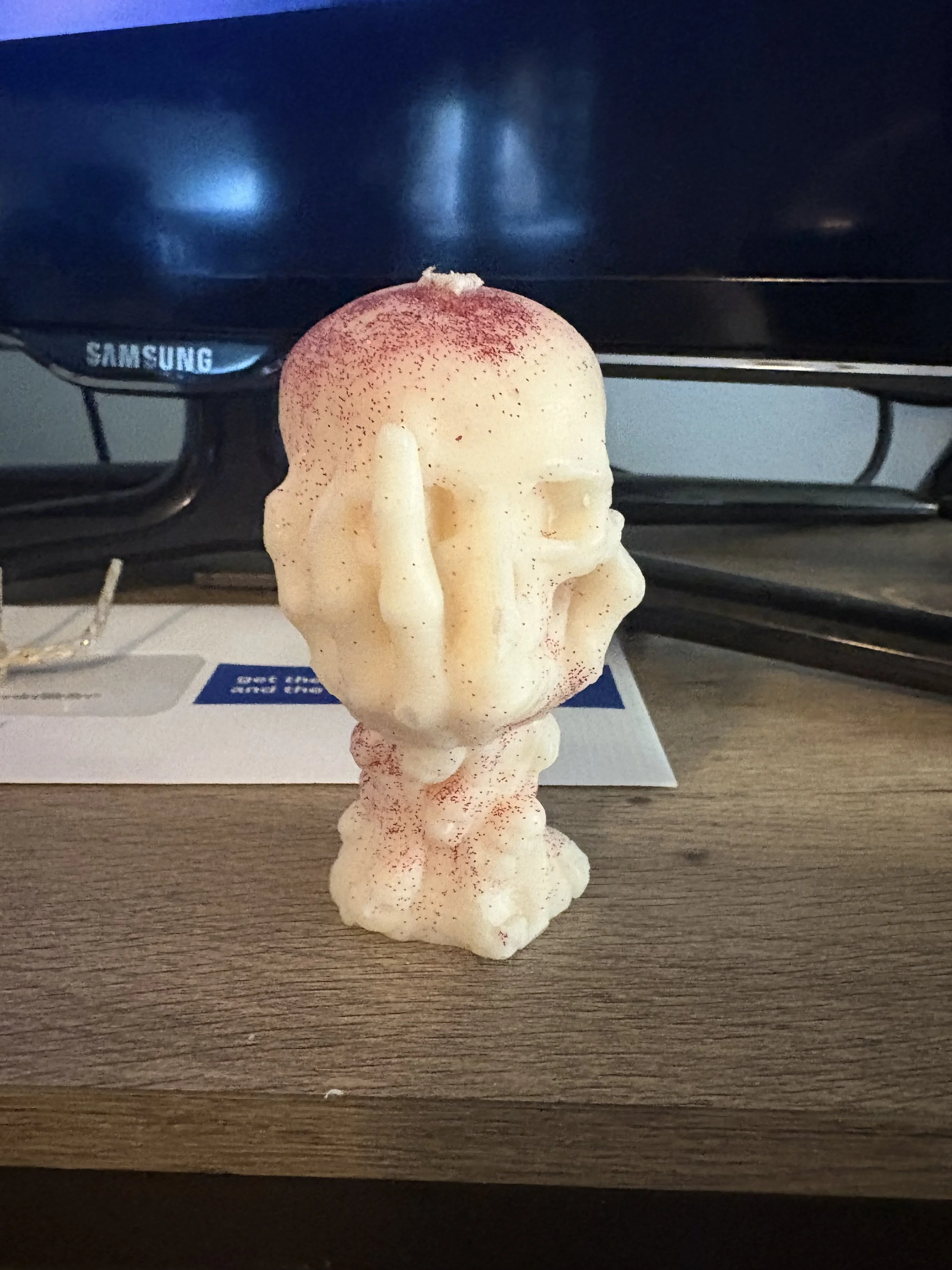 Shop › Skull in hand Image 1 of 2 Image 2 of 2 Skull in hand from $7.99 Color: Select Color Natural Black Quantity: Add To Cart Added! Reaper Pillar Candle $9.99 Color: Grey Pink Red Yellow White Add To Cart You Might Also Like Owl Candle White $12.99 Sphere $7.99 Decorative Candle $6.99 The Bleeding Skull $14.99 Owl Candle $6.99
